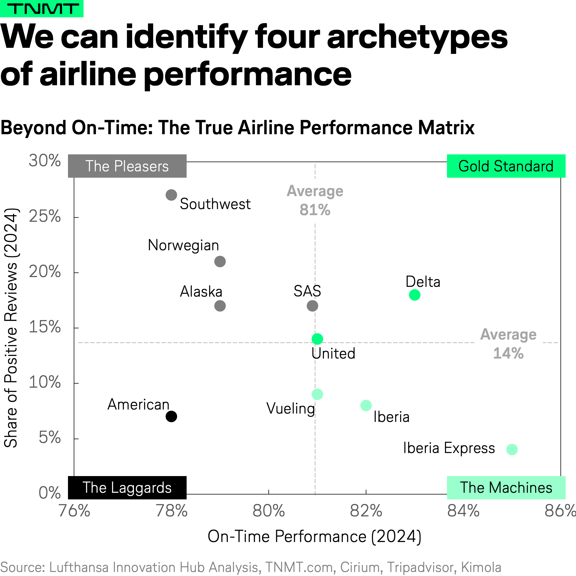 In fact, some airlines seem to have cracked the code on how to compensate for lower punctuality with other levers of satisfaction.
