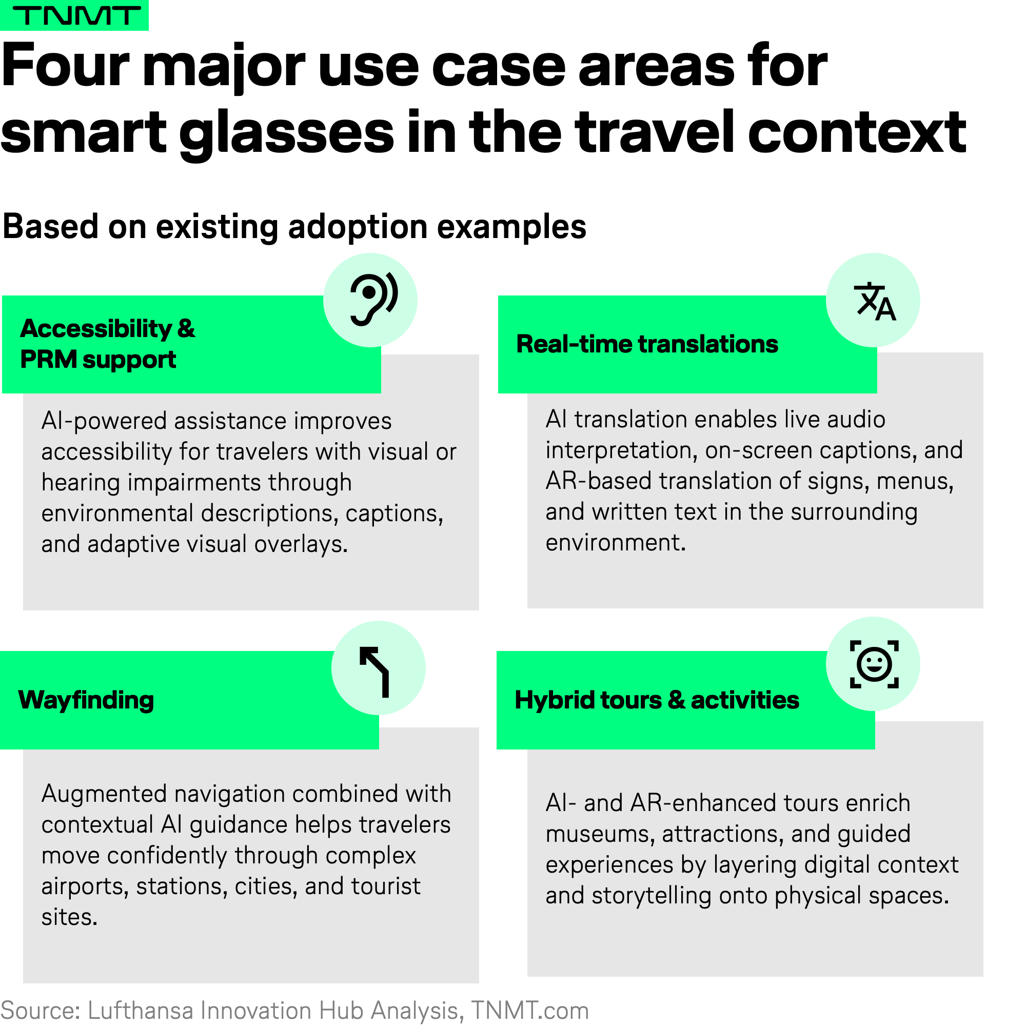 Drawing from existing deployments and early adoption, we see four major smart-glasses use case areas emerging across the travel journey.